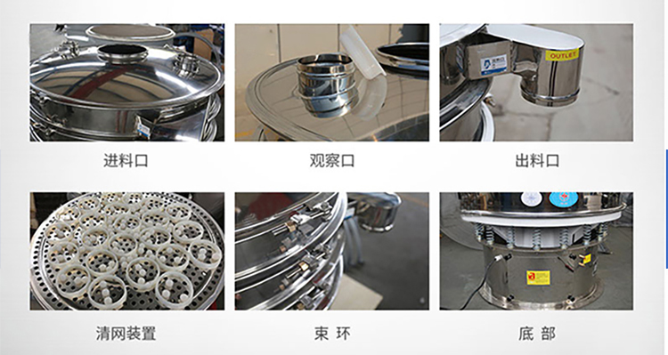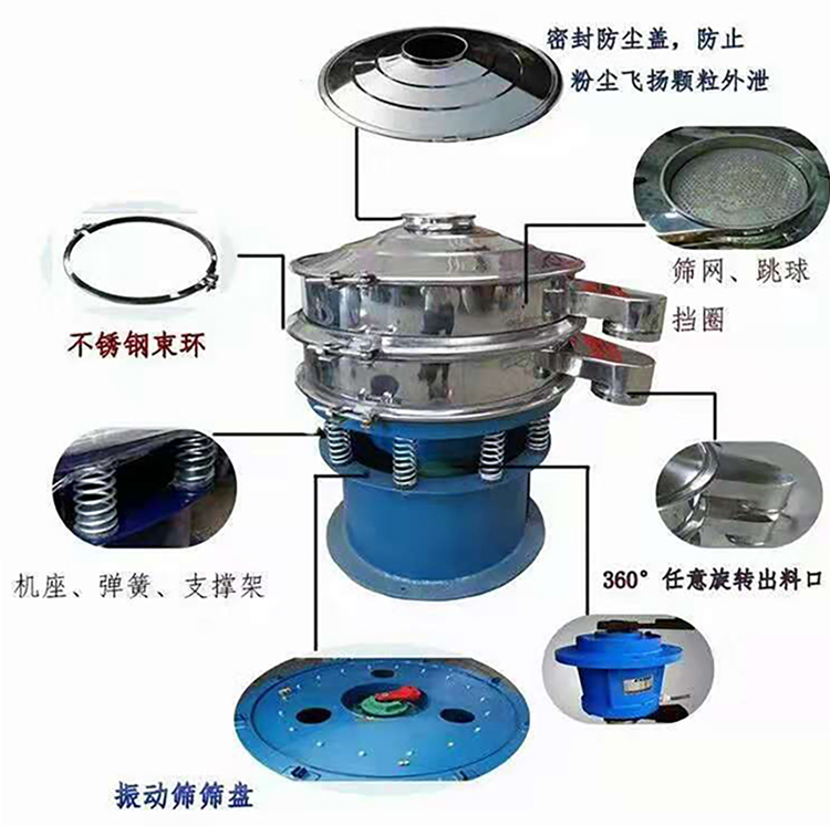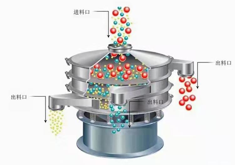 三次元旋振篩由直立式電機作激振源,電機上、下、兩端安裝有偏心重錘,將電機的旋轉運動轉變為水平、垂直、傾斜的三次元運動,再把這個運動傳遞給篩面。調節上、下兩端的相位角,可以改變物料在篩面上的運動軌跡。